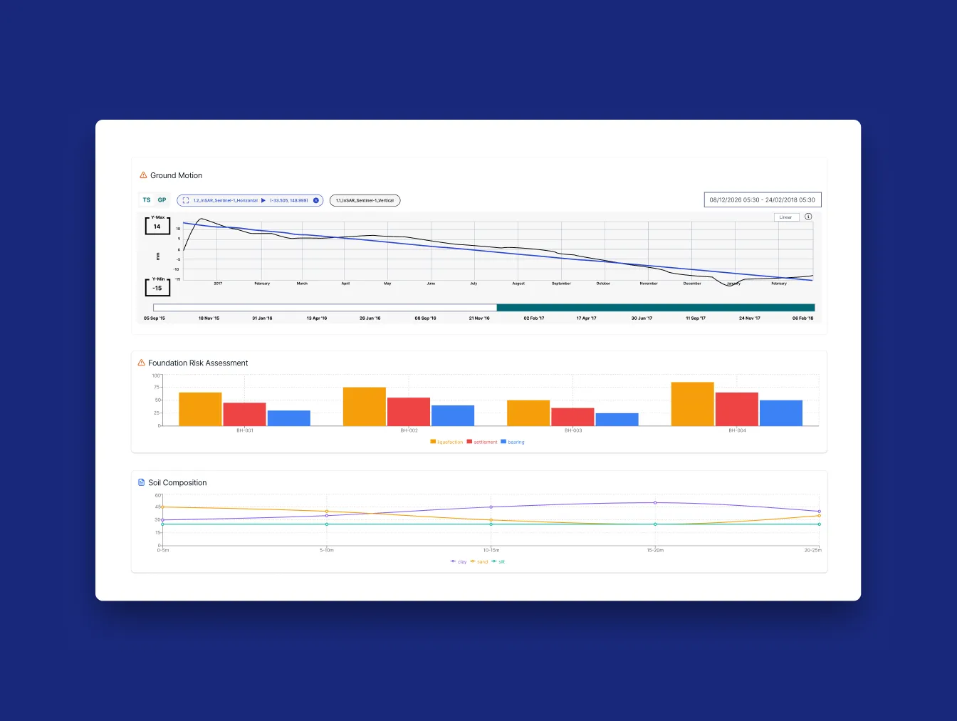 Trends like deformation over time, bearing capacity, or weather information are visualized with graphs and charts to make patterns instantly clear.
