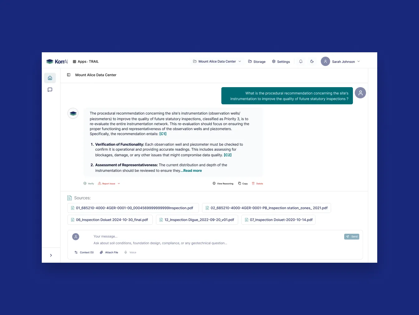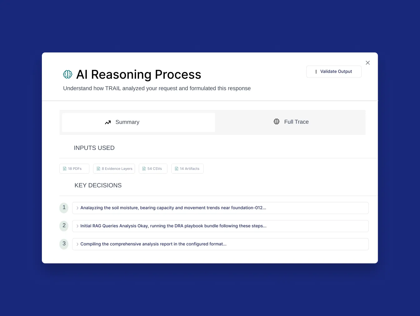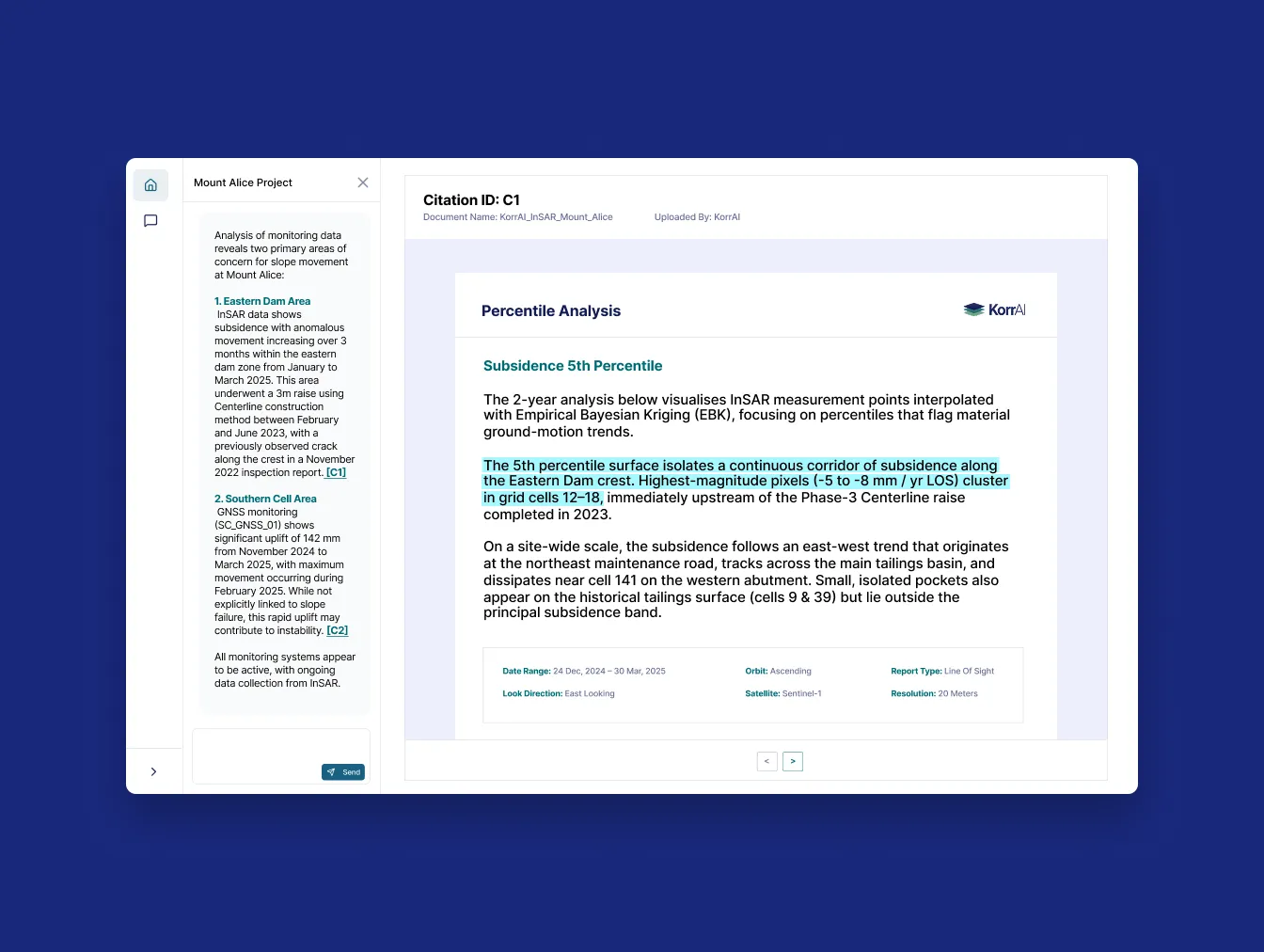 Every response links back to supporting evidence: document page, data point, model output, etc, showing exactly what report, which trend, or classification informed a statement.