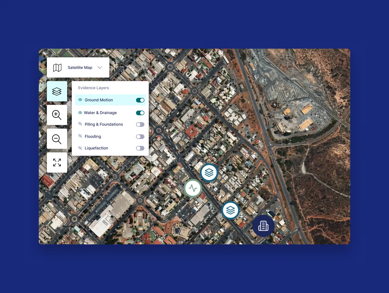Any geospatial data: Ground Deformation, Flood zones, soil types, Instrumentation can be overlaid on interactive maps showing concentration of risks across the site.